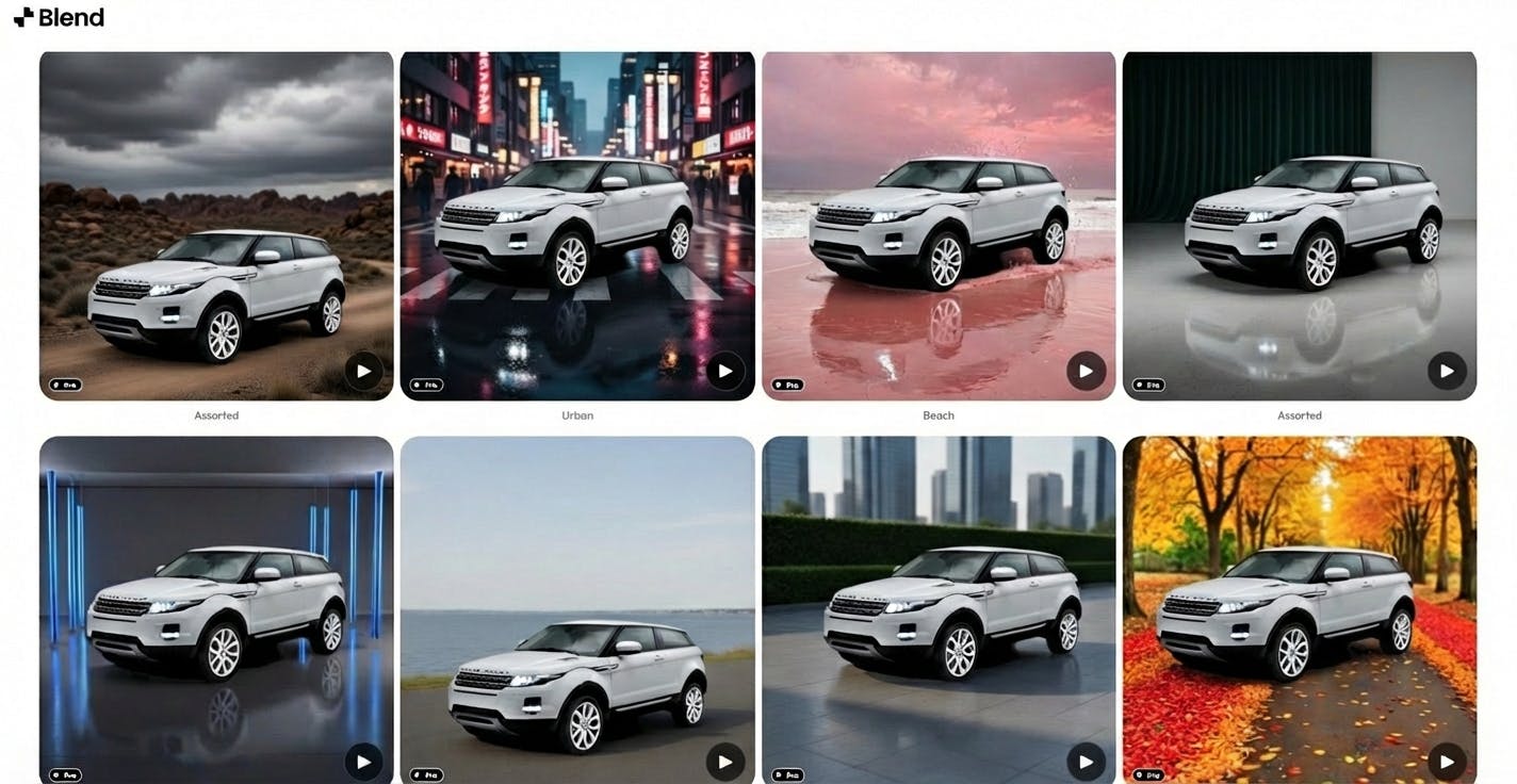 Create clean listing images, realistic lifestyle visuals, contextual backgrounds, and promotional car videos, without studios, reshoots, or agency dependency. Blend helps car dealerships present vehicles more professionally, update inventory faster, and drive more buyer interest across websites, marketplaces, and ads.